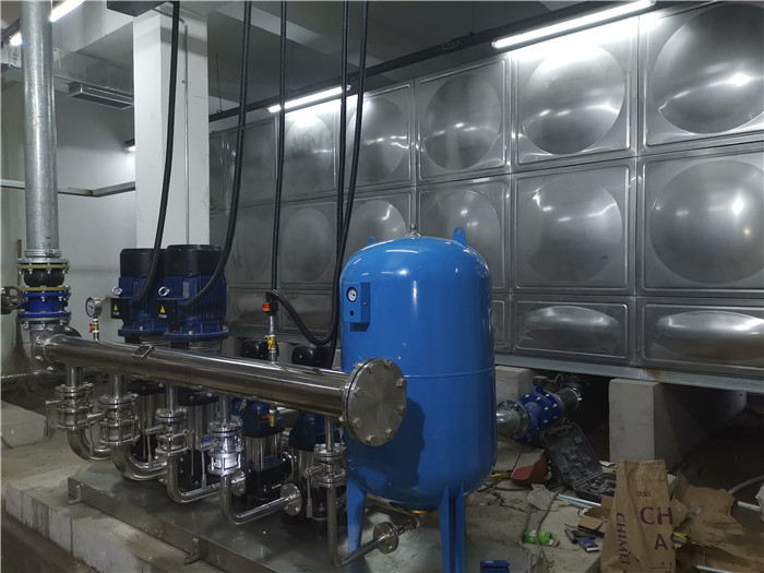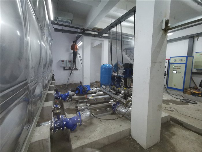该酒店供水系统,由不锈钢蓄水池、紫外线******器、臭氧******器、低区变频成套给水设备、高区变频给水设备等组成。